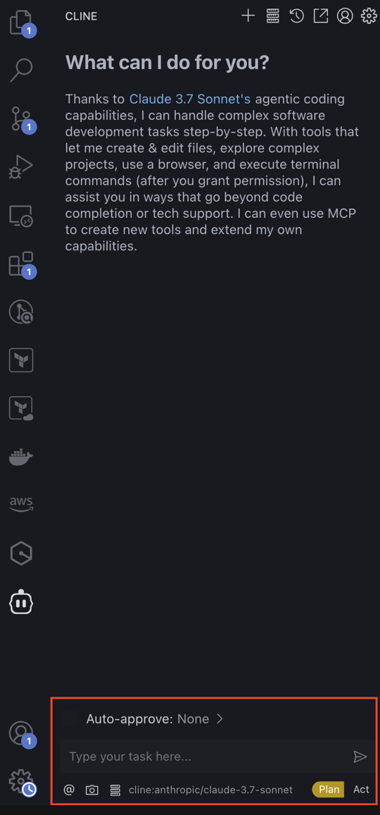 Planwhich will provide the output for you to take manual action on (e.g. providing you a sample configuration that you copy and paste into a file). However, you can optionally toggle this toActwhich will allow Cline to act on your behalf (e.g. searching for content using a web browser, cloning a repository, executing code, etc). You can optionally toggle on the "Auto-approve" section to avoid having to click to approve the suggestions, however we recommend leaving this off during testing, especially if you have the Act toggle selected.