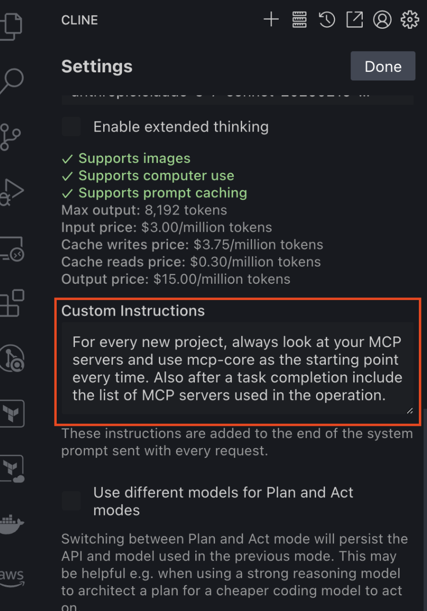 - Once installed, you should see a list of your MCP Servers under the MCP Server Installed tab, and they should have a green slider to show that they are enabled. See the following for an example with two of the possible AWS MCP Servers. Click Done when finished. You should now see the Cline chat interface.