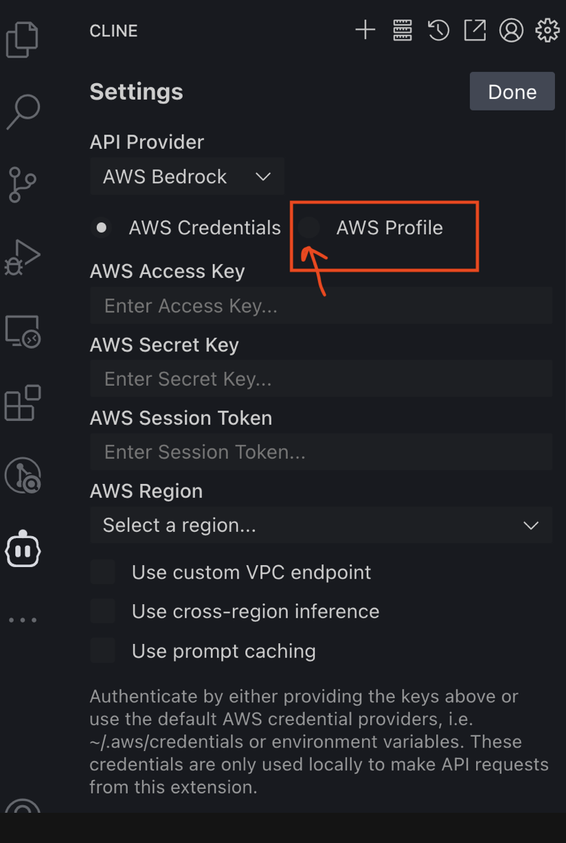 - Fill out the configuration based on the existing AWS Profile you wish to use, select the desired AWS Region, and enable cross-region inference.