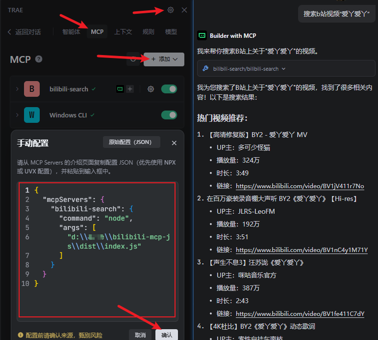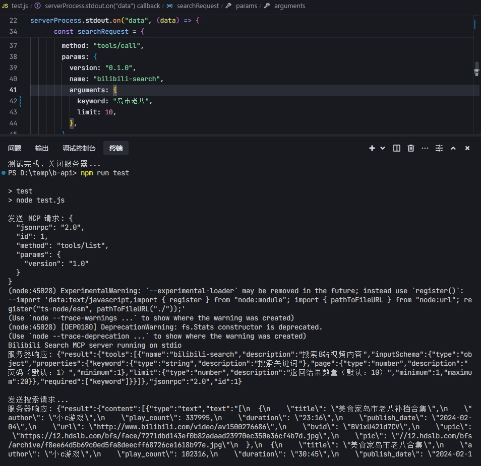 需要编译之后才可以使用. 先npm run build然后这里改成你build之后的dist文件夹路径,"args": ["d:\your-path\bilibili-mcp-js\dist\index.js"]
