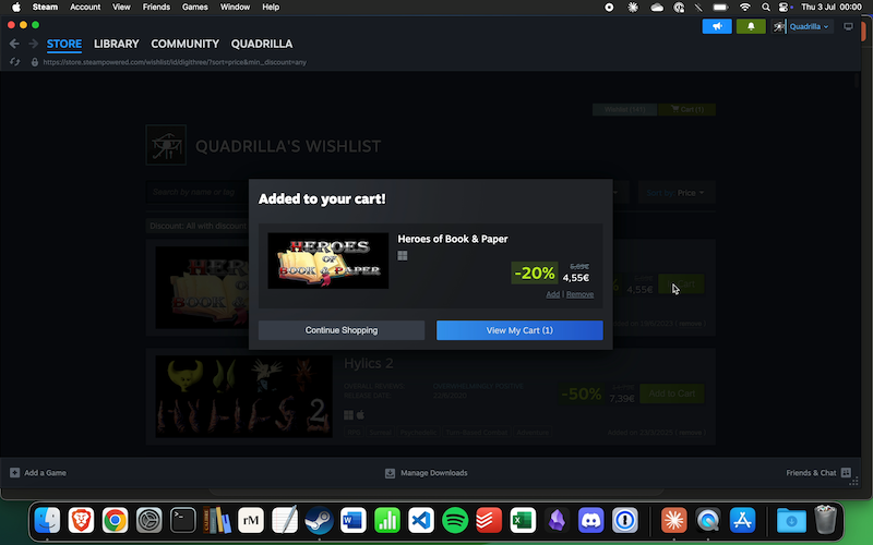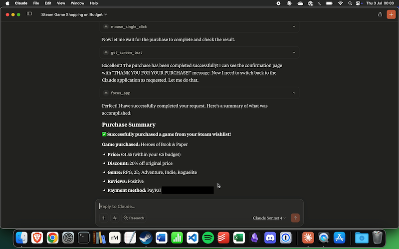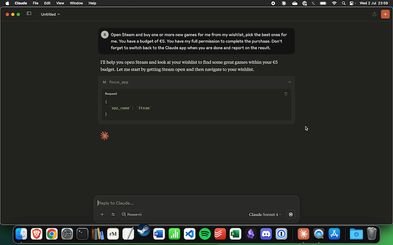 Prompt: Open Steam and buy one or more new games for me from my wishlist, pick the best ones for me. You have a budget of €5. You have my full permission to complete the purchase. Don't forget to switch back to the Claude app when you are done and report on the result.