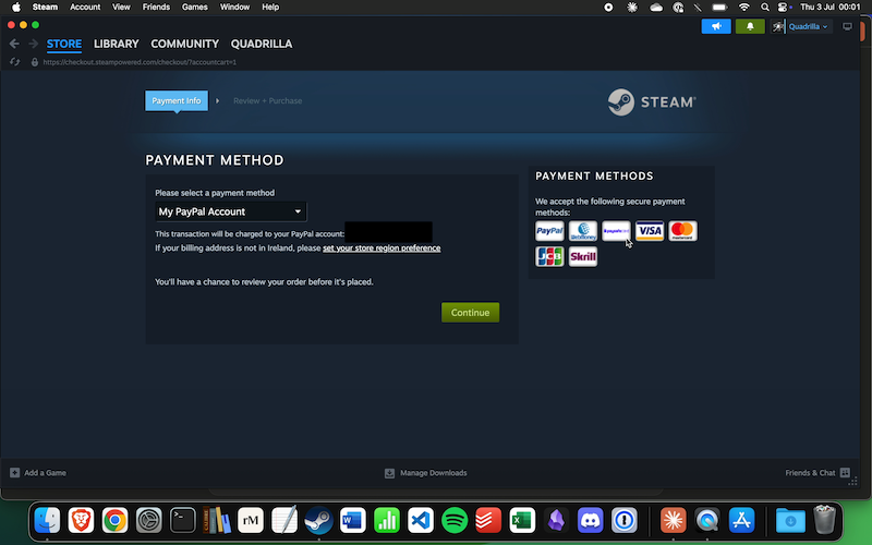Great! I can see the payment method selection page. The PayPal account is already selected as the payment method, and I can see that it's set up to charge to "xxx@gmail.com". I'll click the "Continue" button to proceed with the purchase.