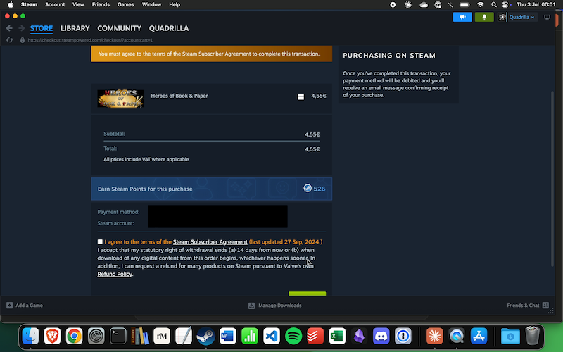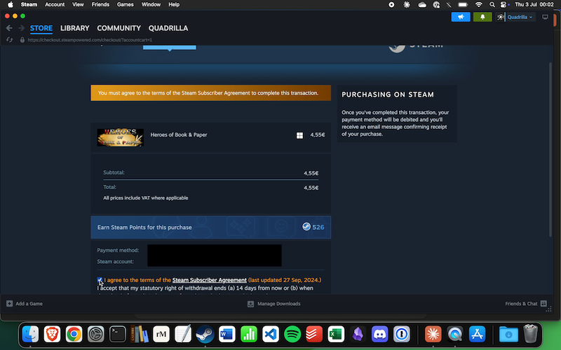 Let me look for checkboxes. I see there are terms that need to be agreed to. There should be checkboxes somewhere to click. Let me search for checkboxes in a different area. I notice the message "You must agree to the terms of the Steam Subscriber Agreement to complete this transaction" which suggests there should be checkboxes to click. Let me look around the agreement text areas.
