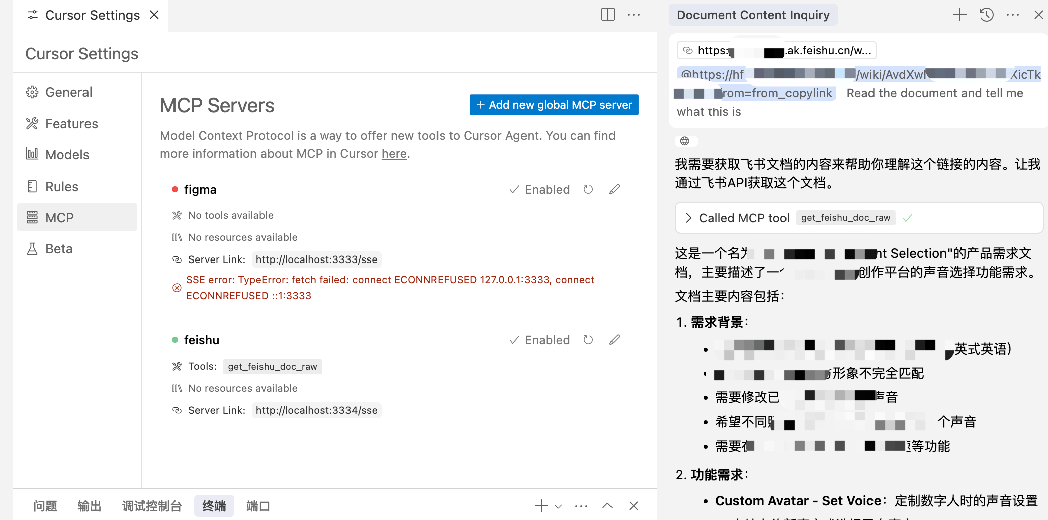 通过打通飞书与cursor,向LLM提供读取文档、发送消息、合同审批、数据处理.....